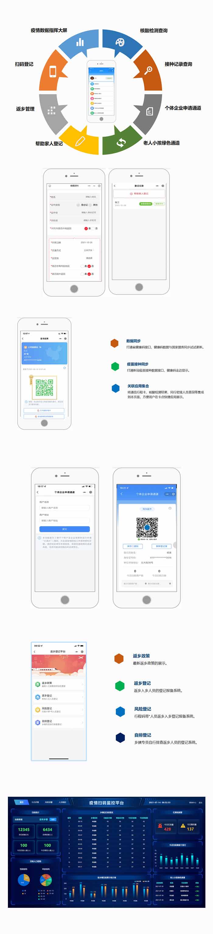 “疫情防控大數(shù)據(jù)服務(wù)平臺(tái)”是由鄭州開拓者科技電子科技有限公司研發(fā),旨在利用互聯(lián)網(wǎng)大數(shù)據(jù)技術(shù),幫助地方政府建立更完善、更系統(tǒng)、更有效的疫情防控體系。系統(tǒng)前端采用微信小程序展現(xiàn),配備數(shù)據(jù)指揮大屏,從疫情普查、全域監(jiān)測、返鄉(xiāng)管理、數(shù)據(jù)指揮四個(gè)維度為政府疫情監(jiān)控提供全方位數(shù)字支撐。