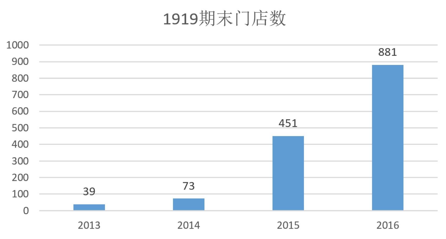 1919的愿景是“打造新零售平臺(tái)”,作為“基石”的線下門店是戰(zhàn)略布局的重中之重。截至2013年末,1919開業(yè)門店數(shù)僅為39家。2016年末達(dá)到881家,年均復(fù)合增長率達(dá)182.7%。