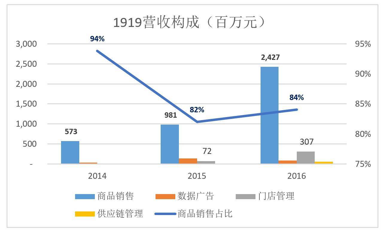從2014年開始,三年時(shí)間1919在門店建設(shè)、倉儲(chǔ)、IT方面有巨額投入,還需負(fù)擔(dān)供應(yīng)鏈管理、網(wǎng)站維護(hù)、戰(zhàn)略性推廣等方面的成本。2016年1919凈虧損率不到3%,可以說在可控范圍之內(nèi)。
