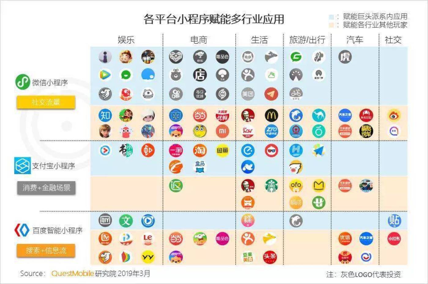 談及小程序,幾乎不可能繞開的一個(gè)詞是「賦能」,下圖是 QM 報(bào)告中關(guān)于各巨頭小程序在諸多行業(yè)的影響力布局: