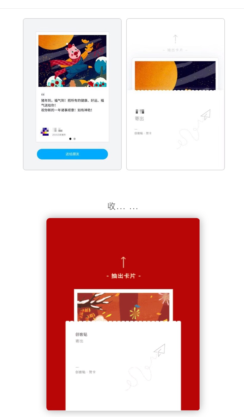 用戶b點(diǎn)擊領(lǐng)取賀卡,此時(shí)用戶會(huì)獲得一個(gè)完整的卡片領(lǐng)取儀式感體驗(yàn)——抽出卡片,并有卡片翻轉(zhuǎn)的體驗(yàn);