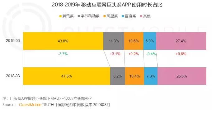 此外,QuestMobile數(shù)據(jù)還指出,相較2018年,2019年騰訊系A(chǔ)pp使用時(shí)長(zhǎng)占比降幅達(dá)3.7%,字節(jié)跳動(dòng)系占比則增長(zhǎng)3.1%,而對(duì)比2017年,2018年相應(yīng)數(shù)據(jù)分別是-6.6%、+6.2%。這也就意味著,使用字節(jié)跳動(dòng)產(chǎn)品的用戶越來(lái)越多,并且正在逐漸蠶食原本屬于BAT的部分流量。