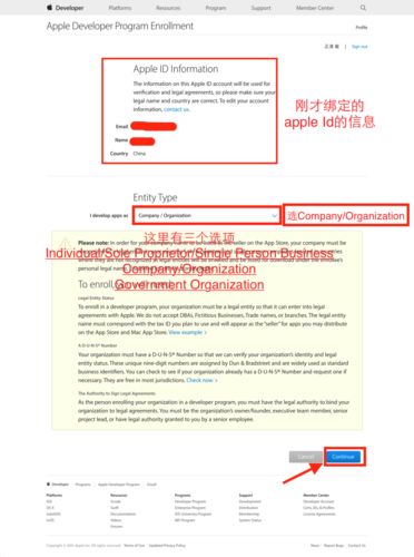 4.下面是綁定的apple Id的信息,Entity Type是所要?jiǎng)?chuàng)建的開(kāi)發(fā)者賬號(hào)類型,選擇company/organization。直接點(diǎn)擊Continue,如下圖: