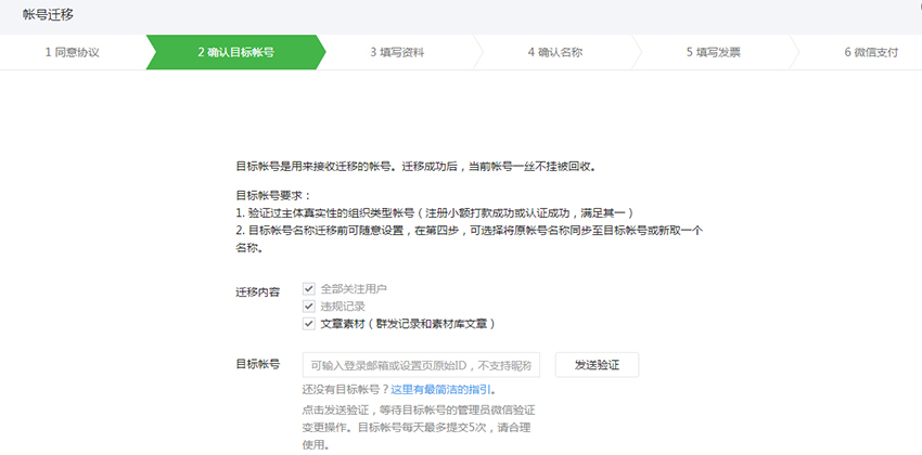 2)目標(biāo)賬戶(hù)B必須是驗(yàn)證過(guò)主體信息【小額打款驗(yàn)證或認(rèn)證成功(包括資質(zhì)審核成功)】的組織類(lèi)訂閱號(hào)或服務(wù)號(hào)。