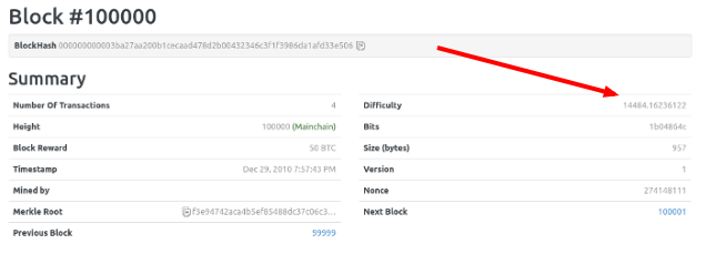 原來(lái),區(qū)塊頭包含一個(gè)難度系數(shù)(difficulty),這個(gè)值決定了計(jì)算 Hash 的難度。舉例來(lái)說(shuō),第100000個(gè)區(qū)塊的難度系數(shù)是 14484.16236122。