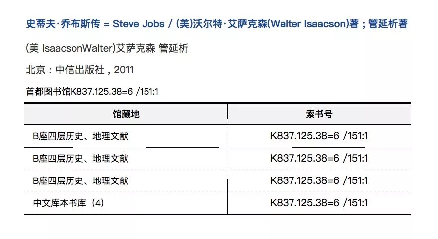 例如,要去首都圖書館借閱《史蒂夫·喬布斯傳》這本書,我們先去檢索系統(tǒng)里查找有沒有這本書,檢索結(jié)果告訴我們,這本書存放在B座四層歷史、地理文獻(xiàn)去(K837)。這樣就能很容易找到這本書。