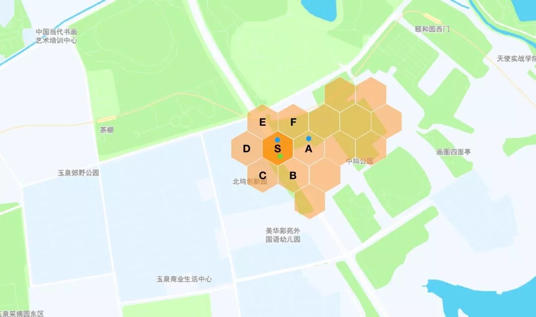 例如,圖中將地圖劃分成了若干蜂窩狀區(qū)域,并對區(qū)域進(jìn)行了編號:S、A、B、C、D、E、F,綠色點(diǎn)為乘客呼叫位置,藍(lán)色點(diǎn)為可派單范圍司機(jī)。