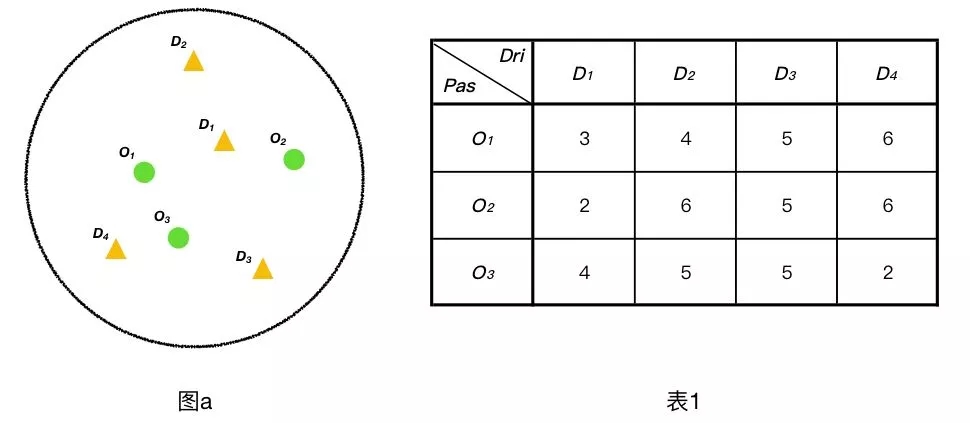 如下圖a,假設(shè)在某可派單區(qū)域內(nèi),同時(shí)有O1、O2、O3三名乘客同時(shí)開始呼叫,此時(shí)在該區(qū)域內(nèi)正好有四名司D1、D2、D3、D3。