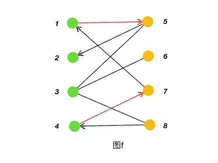 增廣路:從一個(gè)未匹配點(diǎn)出發(fā),走交替路,如果途經(jīng)另一個(gè)未匹配點(diǎn)(出發(fā)的點(diǎn)不算),則這條交替路稱為增廣路。例如,圖 f 中的一條增廣路:8→4→7→1→5→2。